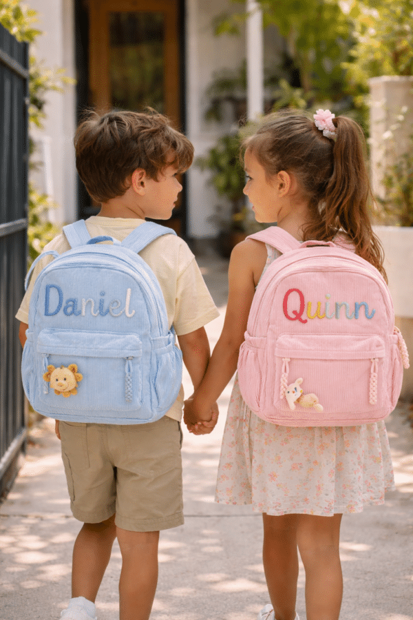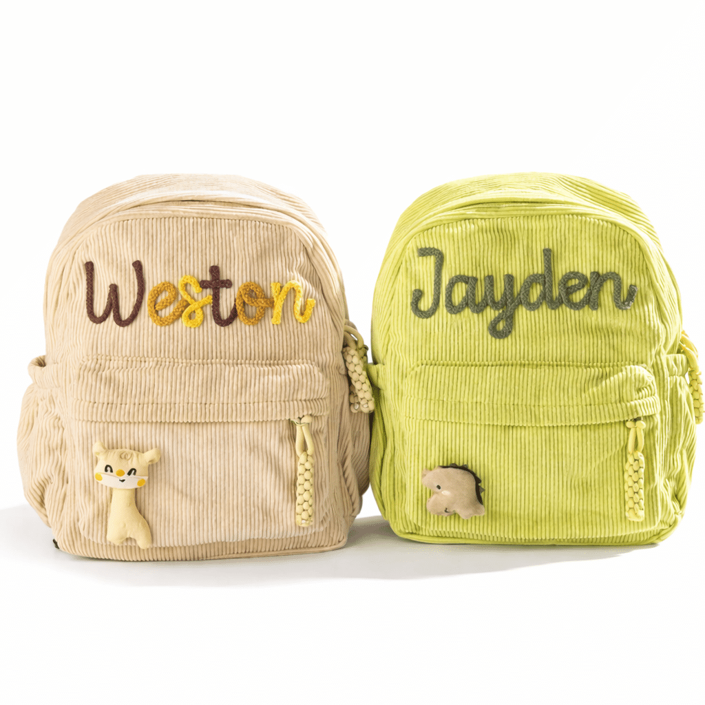 Make every school day special with our personalised kids backpack, designed for style, comfort, and individuality. This adorable custom name backpack features soft corduroy fabric, playful animal charms, and beautifully embroidered names — perfect for daycare, preschool, or everyday adventures.